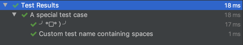 테스트명을 한글, 띄어쓰기가 있는 엄청 긴 이름, 특수문자나 이모지도 넣기가 가능. 위의 코드를 테스트를 수행하면 이렇게 표현이 된다.
