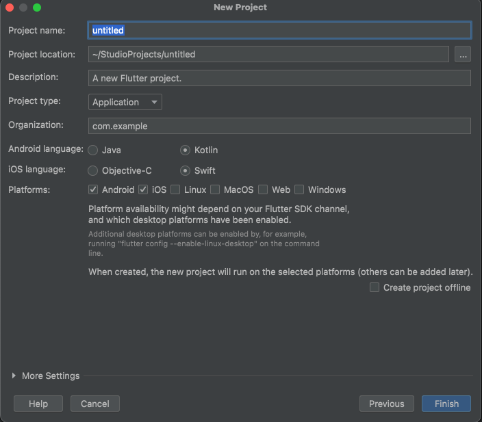 설치 후 재시작을 해주면 Projects > New Flutter Project 가 생겼다.