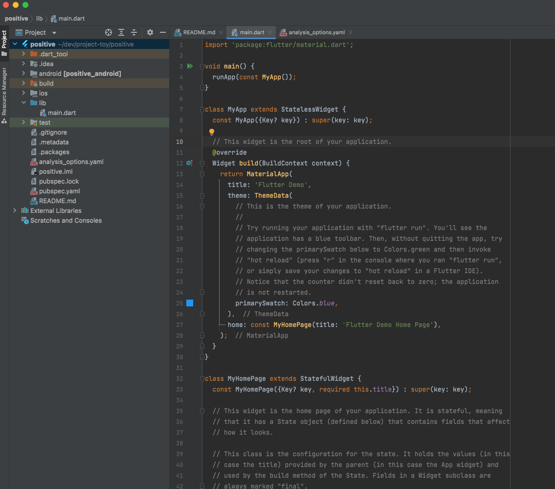 프로젝트 생성 완료! main.dart 파일에 예제로 코드가 미리 입력되어있는 것을 볼 수 있다.