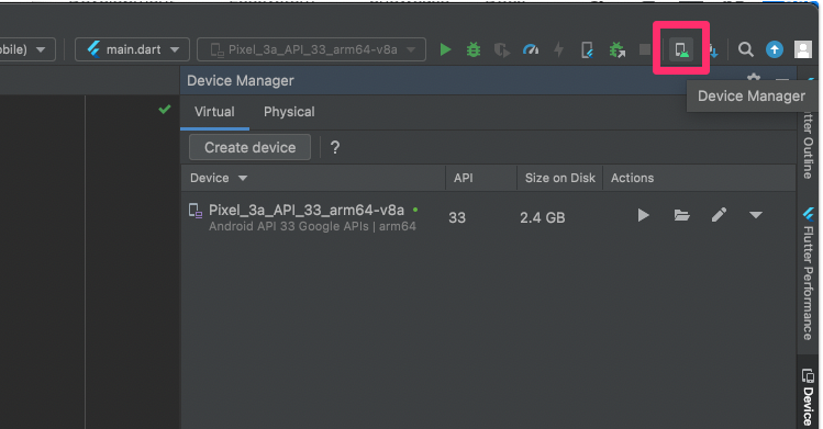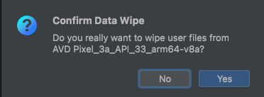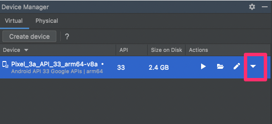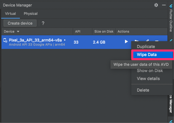 바꾼 설정값은 자동으로 반영되지 않기 때문에, 수동으로 AVD의 풀다운메뉴를 열고 데이터 지워주는 작업이 필요하다.