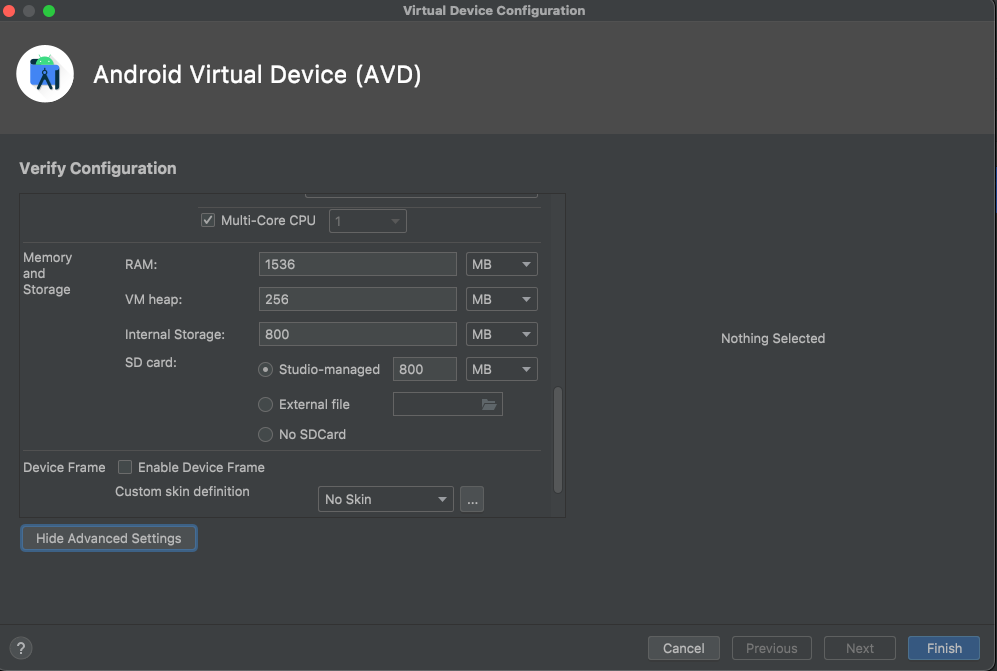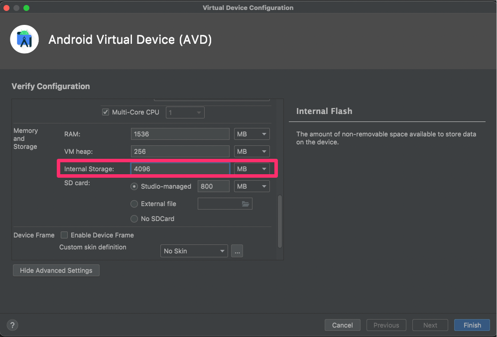 Internal Storage : 기본값 800 MB -> 4096MB 정도로 늘려주고, Finish 버튼 클릭