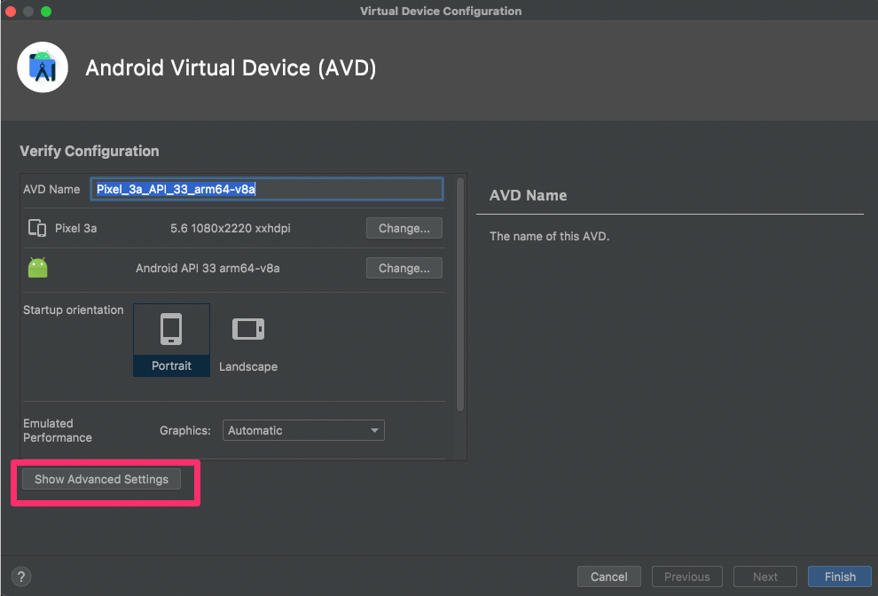 Android Virtual Device 화면의 하단의 Show Advanced Settings를 클릭