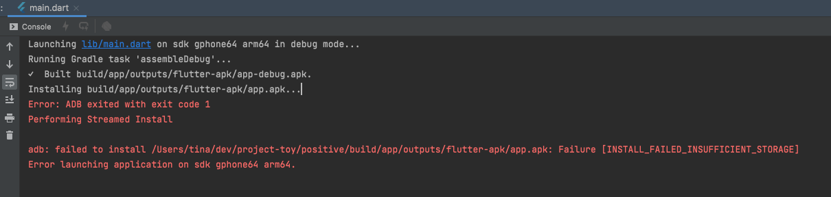 adb: failed to install /Users/buri/dev/project-toy/positive/build/app/outputs/flutter-apk/app.apk: Failure [INSTALL_FAILED_INSUFFICIENT_STORAGE]