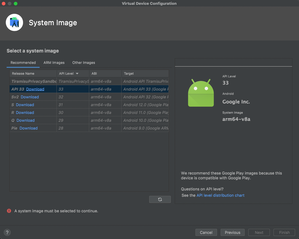 API 33을 Download 해줘야, 하단의 Next 버튼이 활성화됩니다.