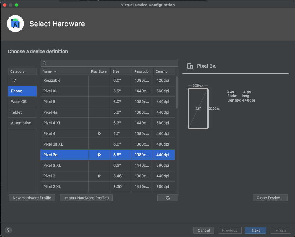 그냥 잘 모르니, 원래 기본으로 등록되어있던 에뮬레이터를 똑같이 선택해줍니다. Pixel 3a