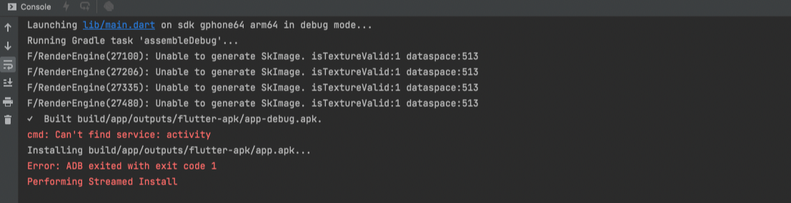 adb: failed to install /Users/buri/dev/project-toy/flutter/build/app/outputs/flutter-apk/app.apk: cmd: Can't find service: package