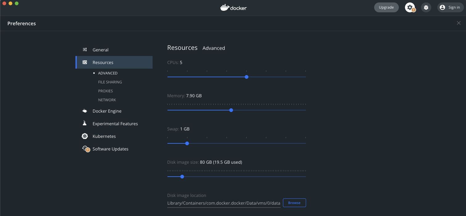 Preferences > Resources > Advanced 에서, Disk Image size를 늘려주기 > 적용을 위해 Docker desktop 재시작