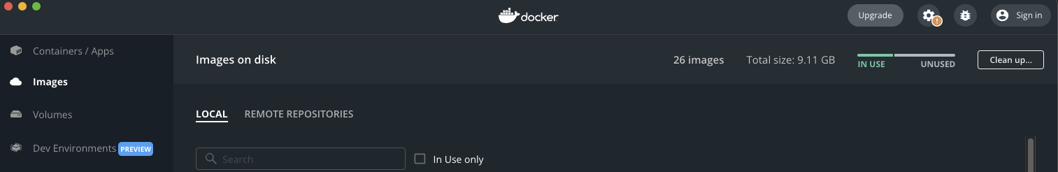 Preferences > Resources > Advanced 에서, Disk Image size를 늘려주기 > 적용을 위해 Docker desktop 재시작